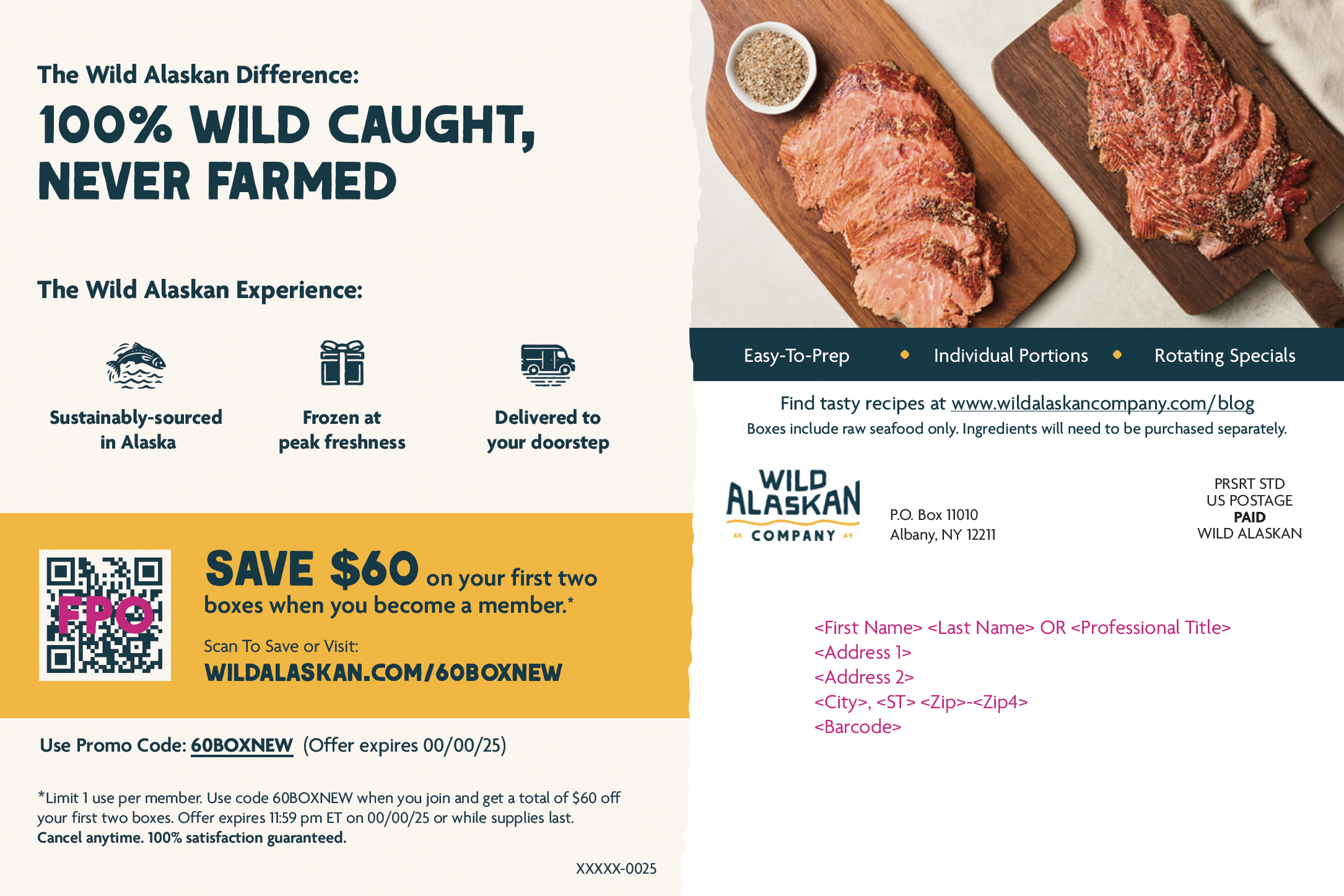 This mailer for Wild Alaskan outperformed their control by 71%. Tari Johnson was the creative director; Scott Gerber, the designer.